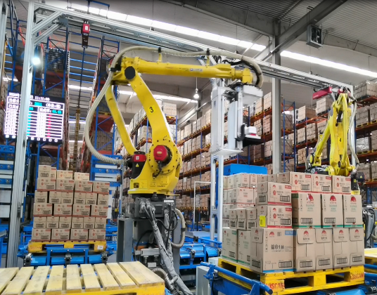 應用4套力生智能揀選機器人系統、視覺系統,以及輸送系統、纏膜機、貼標機、集板機、拆板機等一系列自動化設備。按訂單需求柔性自動抓取、揀選、混碼,相當于12-16名揀貨員,極大地削減了人力成本和管理成本,實現了食品加工流程的高度智能化與高效化。